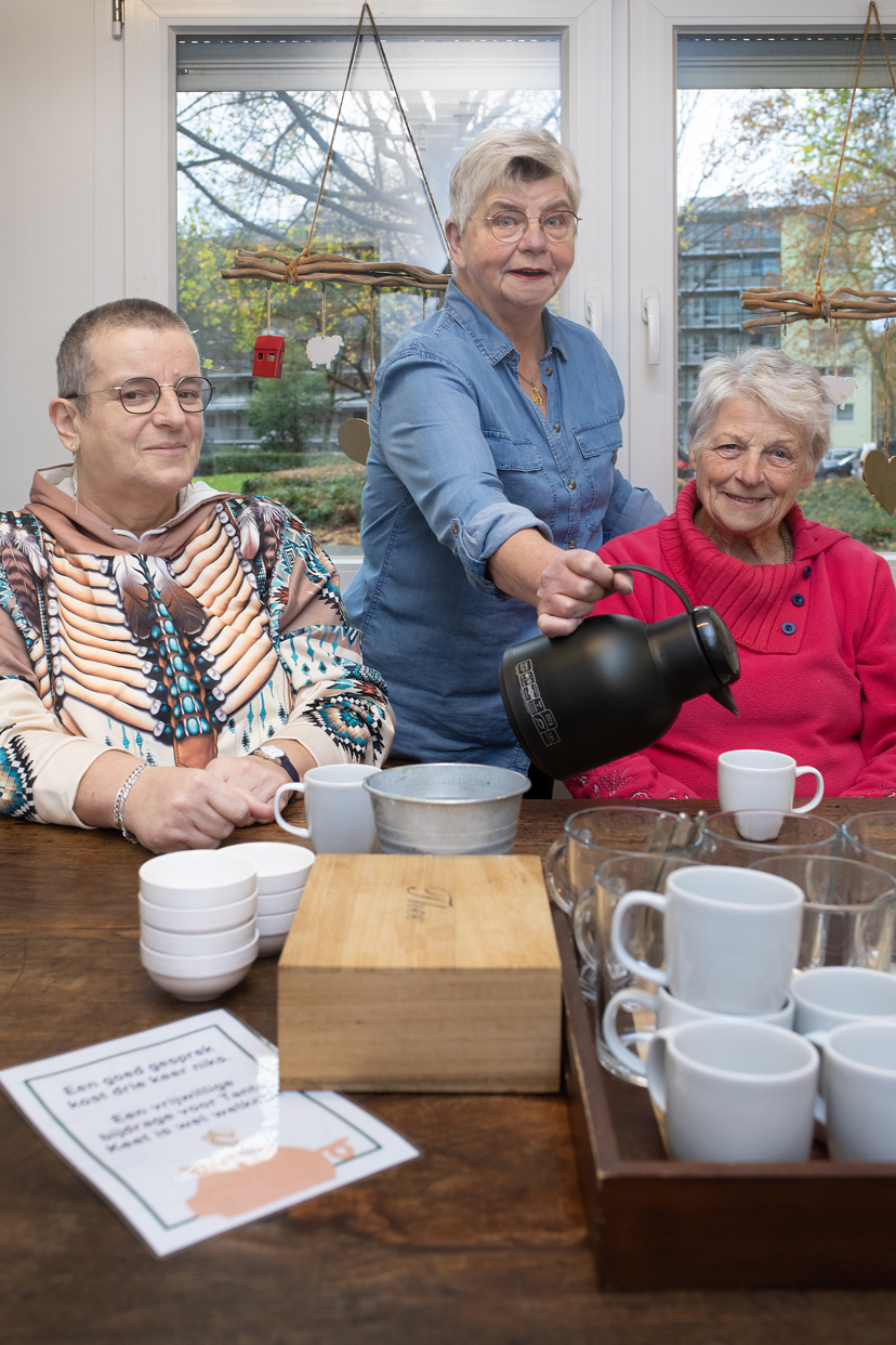 Dat merkte ook Lidwi Waijers. Eerst stond ze wat onverschillig tegenover ‘de keet’. Ze ging toch een keer kijken en merkte dat het er heel gezellig was. Van het een kwam het ander en nu schenkt ze er op de vrijdagochtend koffie en thee. ‘Ik woon hier al 24 jaar en ik voel me voor het eerst echt betrokken bij de Kwendelhof.’